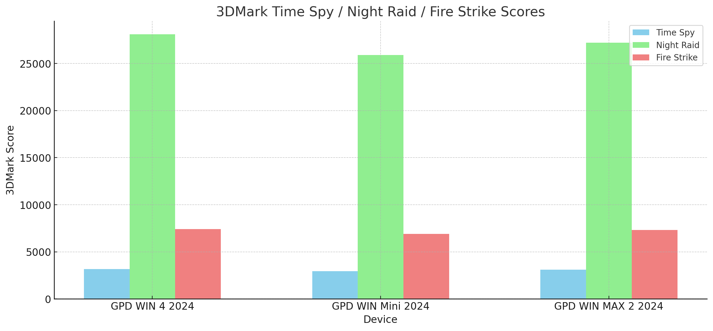 The GPD WIN 4 2024 shows the highest scores among the provided data with the WIN MAX 2 2024 in second place. The WIN Mini 2024 appears to have slightly lower performance in 3DMark tests.