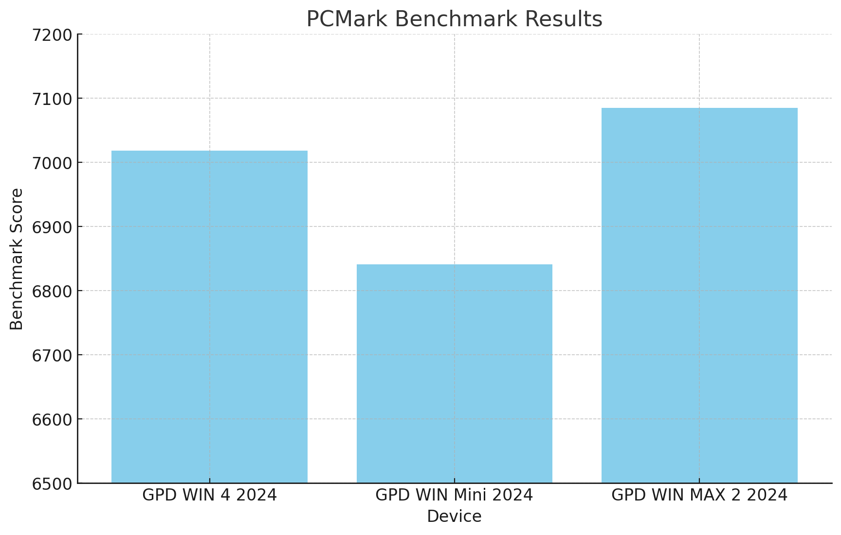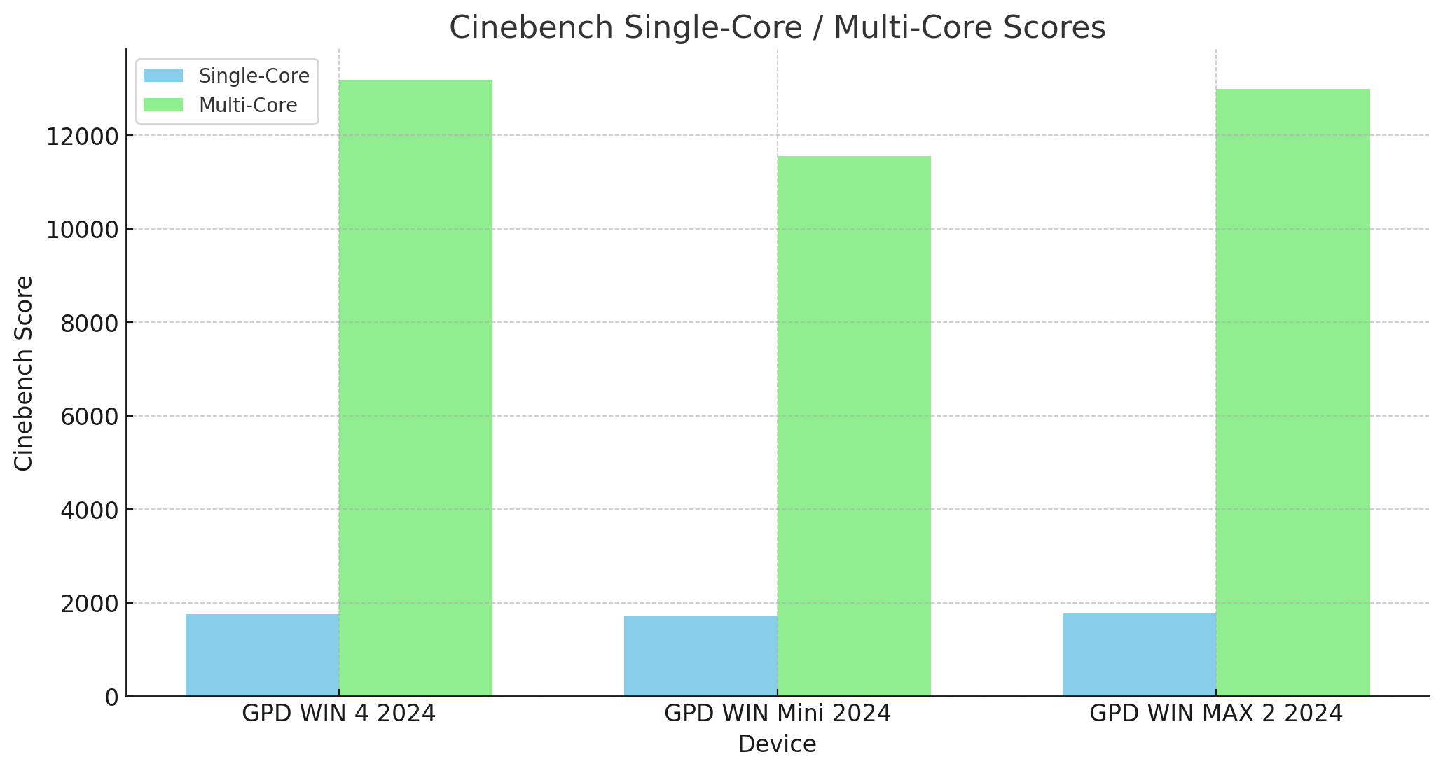 The GPD WIN 4 2024, GPD WIN Mini 2024, and GPD WIN MAX 2 2024 all feature the AMD Ryzen 7 8840U processor, which should lead to similar overall performance across the devices. However, there are some notable differences in benchmark results: