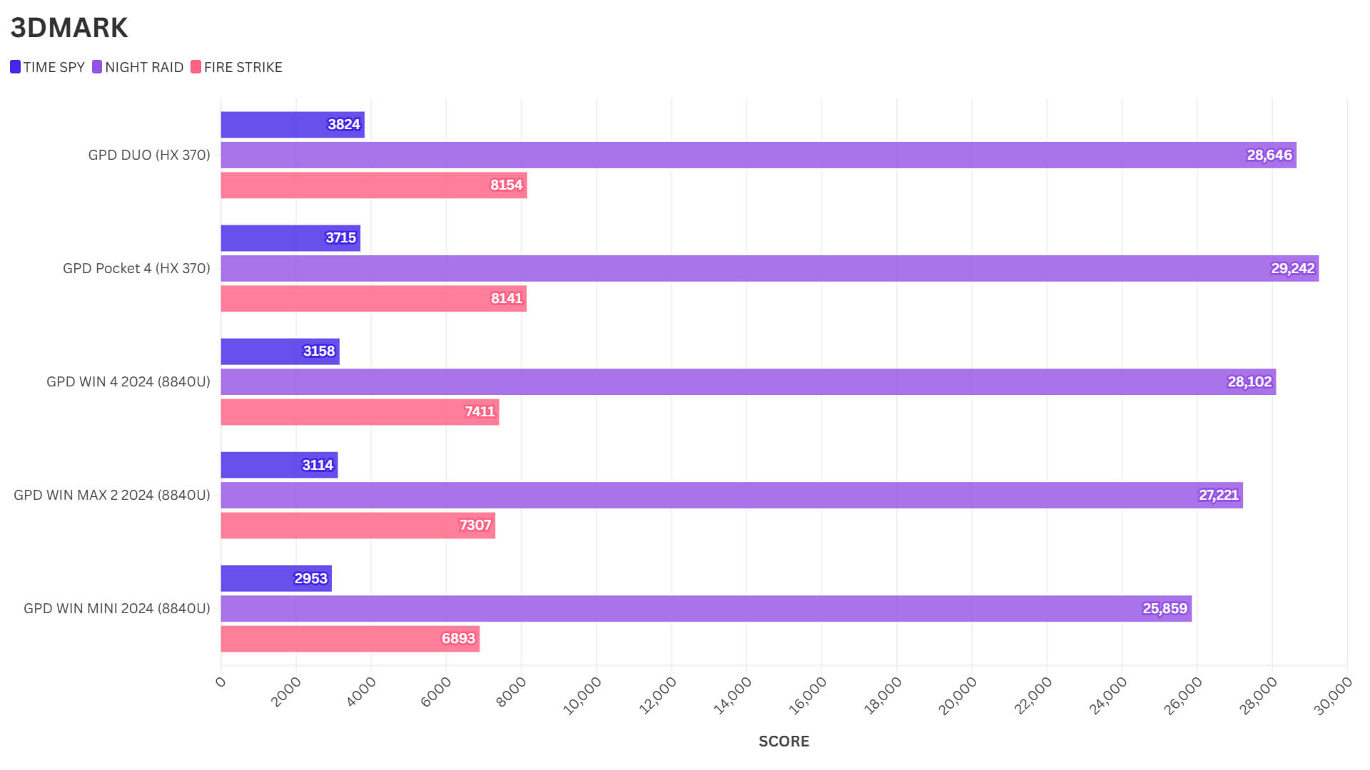 Across the three benchmark tests we got good results for the Pocket 4, comparable with the GPD Duo. Both these models have increased performance over the previous generation 8840U.