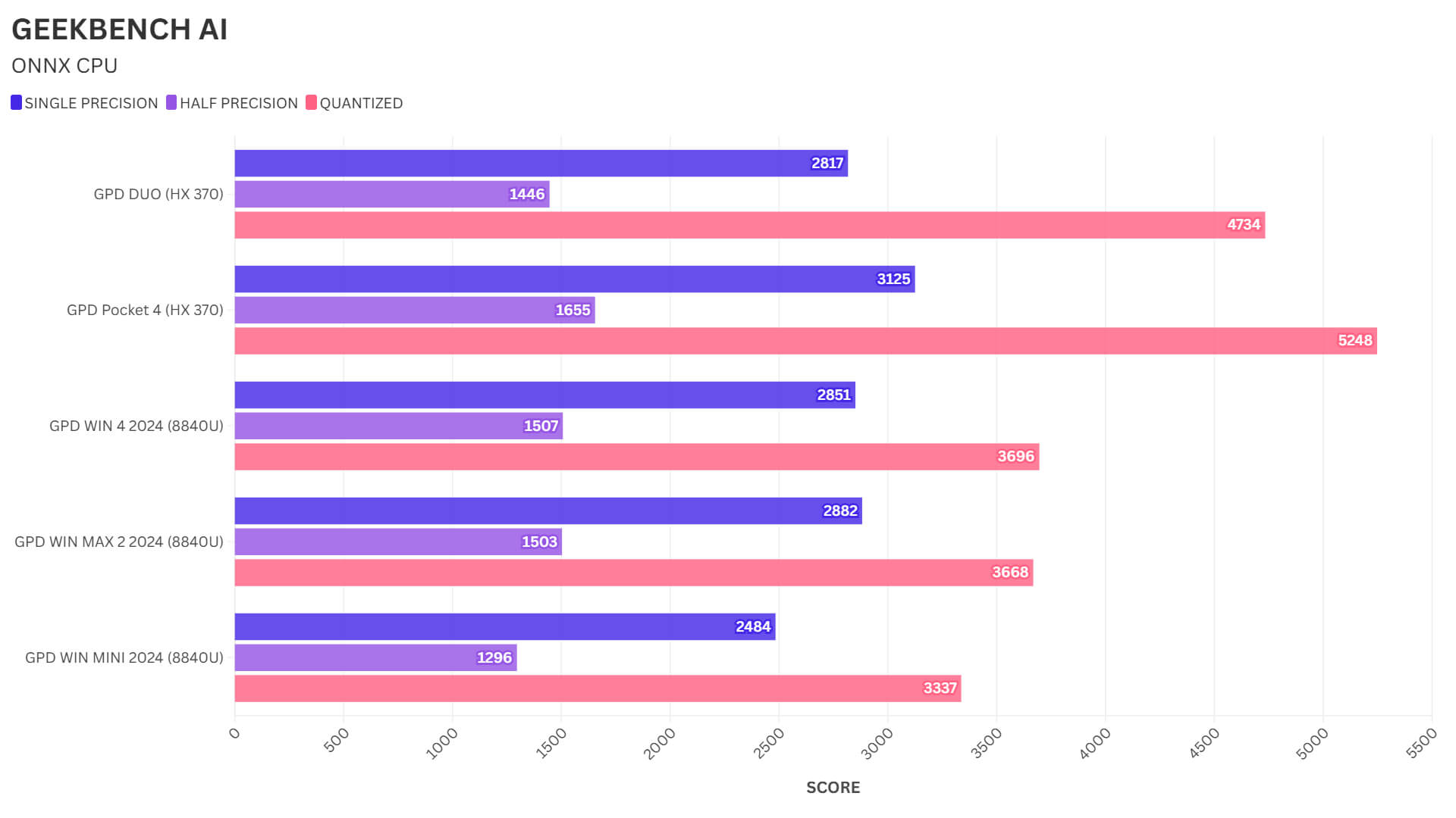 And for the GeekBench AI tests, which as the name suggests, tests the AI performance for the processor. The GPD Pocket 4 got noticeable higher scores than the Duo. We re-ran these tests and got similar scores again, keep in mind these are pre-production models.