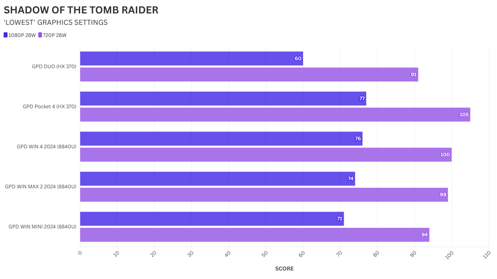 Shadow of the Tomb Raider always gives different results based on the graphics drivers. But we can see the GPD Pocket 4 has the upper hand in both 1080P and 720P benchmark results.