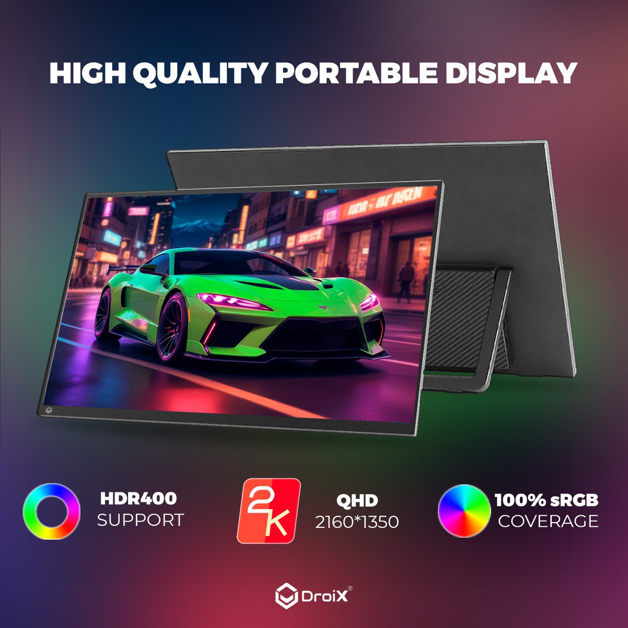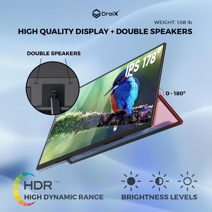 Přenosný monitor DroiX PM13 nabízí výjimečný zážitek ze zobrazení díky svým vynikajícím funkcím. Pyšní se vysokým jasem a podporou HDR a zajišťuje jasnou viditelnost za jakýchkoli světelných podmínek. Stoprocentní pokrytí sRGB a 16,7 milionu barev zajišťují přesnou barevnou přesnost, která je klíčová pro úpravu fotografií a grafický design. Jeho rozlišení 2K na 13palcové obrazovce zaručuje vysokou hustotu pixelů a vytváří ostrý a živý obraz pro text i multimédia. Díky tomu je PM13 špičkovou volbou pro profesionály i nadšence.