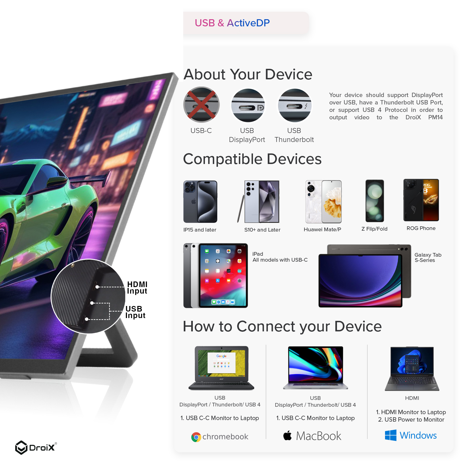 Vyzkoušejte špičkovou všestrannost přenosného monitoru DroiX PM13, který je navržen tak, aby nově definoval kompatibilitu a možnosti připojení k široké škále zařízení. Tento monitor se vyznačuje robustní podporou technologií USB a ActiveDP a lze jej bez problémů integrovat s různými moderními přístroji, od notebooků po chytré telefony a další.