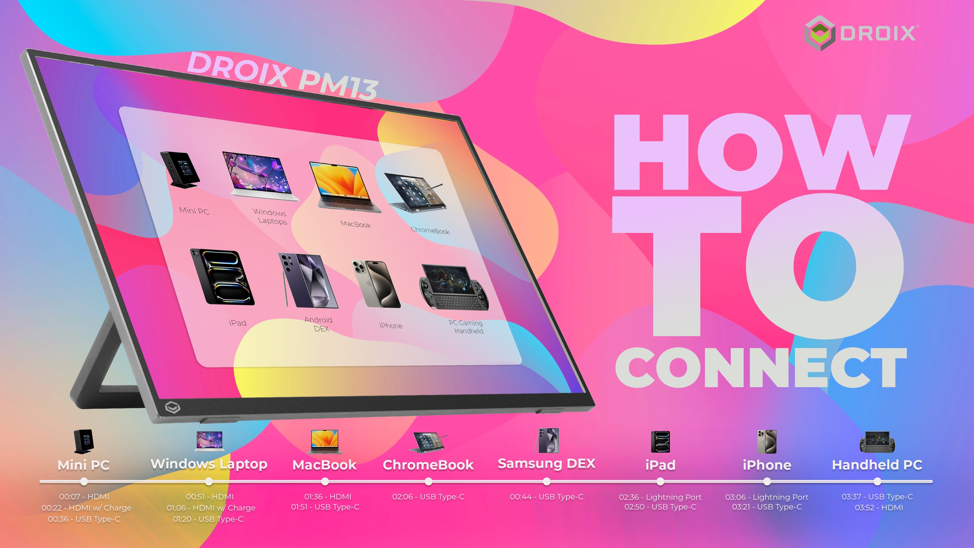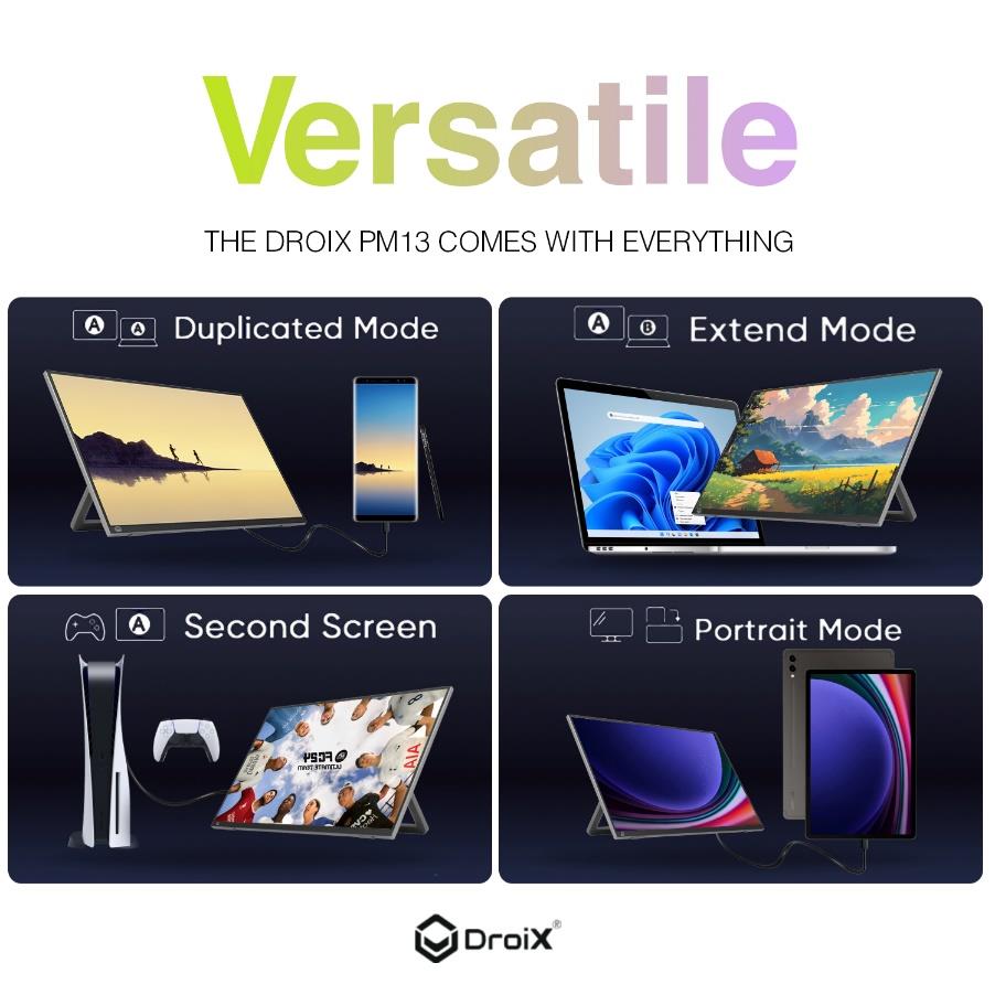 Přenosný monitor DroiX PM13 je příkladem všestrannosti díky rozsáhlým možnostem kompatibility a připojení. Nabízí čtyři všestranné režimy: Duplikovaný režim pro zrcadlení obsahu, režim Extend pro rozšíření pracovní plochy, režim Second Screen pro herní konzole a režim Portrait pro vertikální orientaci. Tato přizpůsobivost z něj činí ideálního společníka pro profesionály, hráče a digitální nomády, který zvyšuje produktivitu a zábavu v různých prostředích.