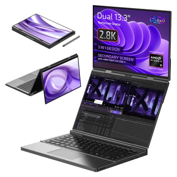 Die erste von 5 bahnbrechenden Eigenschaften des GPD Duo ist sein auffälliges Dual-Screen-Laptop-Setup mit zwei 13,3-Zoll-Displays OLED mit einer beeindruckenden Auflösung von 2880 x 1800. Dieses Dual-Screen-Notebook-Design ist nicht nur wegen seiner schieren Qualität einzigartig, sondern auch wegen der vielseitigen Konfigurationen, die es ermöglicht, die Art und Weise, wie Benutzer mit ihrem Gerät interagieren, zu verändern.