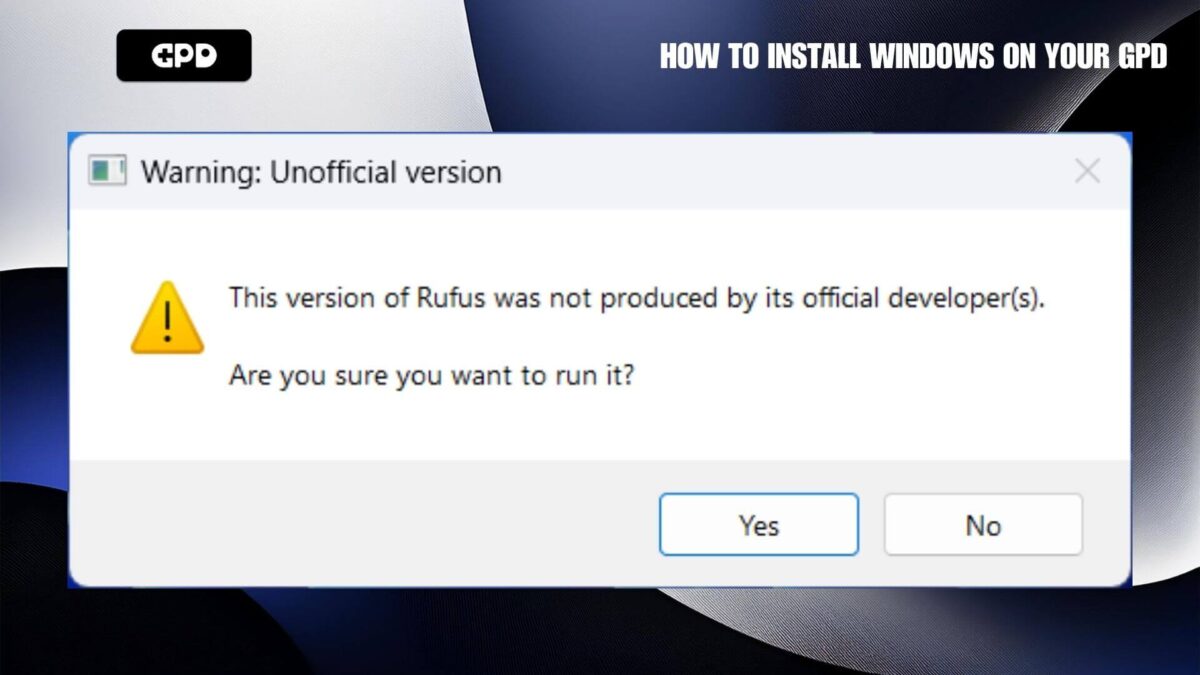 Teil peaks olema Rufus ja Windows .ISO fail teie GPD seadme jaoks. Laadige Rufus ja kui teil palutakse jätkata, klõpsake Yes .