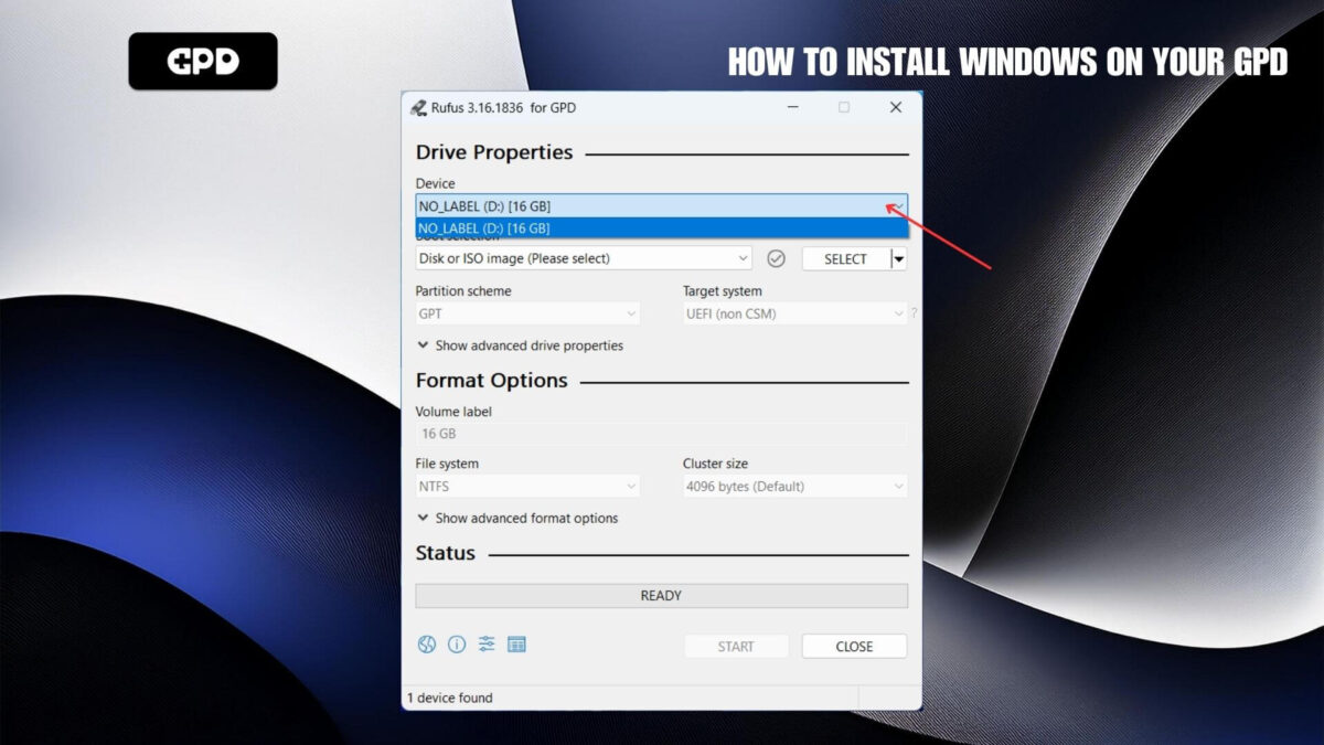 Samuti on teil vaja Rufust, et luua käivitatav USB-pulk. Selle saate alla laadida siit või GPD enda versiooni siit.