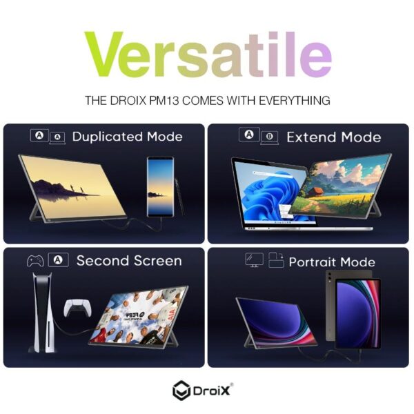Il monitor portatile DroiX PM13 è un esempio di versatilità grazie alle sue ampie opzioni di compatibilità e connettività. Offre quattro modalità versatili: Modalità Duplicata per il mirroring dei contenuti, Modalità Estesa per ampliare lo spazio di lavoro, Secondo schermo per le console di gioco e Modalità Ritratto per l’orientamento verticale. Questa adattabilità lo rende un compagno ideale per professionisti, giocatori e nomadi digitali, in grado di migliorare la produttività e l’intrattenimento in vari ambienti.
