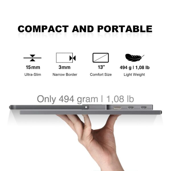 Il DroiX PM13 è un monitor portatile 2K da 13″ elegante e leggero, con un peso di soli 494 grammi. Racchiuso in una sottile cornice di alluminio e con cornici sottilissime da 0,11″, unisce magistralmente stile e praticità. Il vibrante display IPS offre colori ricchi e un ampio angolo di visione di 170 gradi, garantendo un’esperienza visiva accattivante. Grazie alla compatibilità con numerosi dispositivi tramite HDMI e USB-C, il PM13 è lo schermo versatile per eccellenza per migliorare la tua configurazione ovunque tu sia.