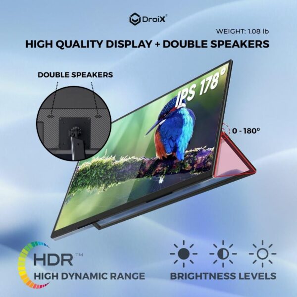 Il monitor portatile DroiX PM13 offre un’esperienza di visualizzazione eccezionale grazie alle sue straordinarie caratteristiche. Grazie all’elevata luminosità e al supporto HDR, garantisce una visibilità chiara in qualsiasi condizione di luce. La copertura sRGB al 100% e i 16,7 milioni di colori offrono una precisione cromatica fondamentale per il fotoritocco e la progettazione grafica. La risoluzione 2K su uno schermo da 13 pollici garantisce un’elevata densità di pixel, producendo immagini nitide e vibranti sia per i testi che per i contenuti multimediali. Questo rende il PM13 la scelta migliore per i professionisti e gli appassionati.