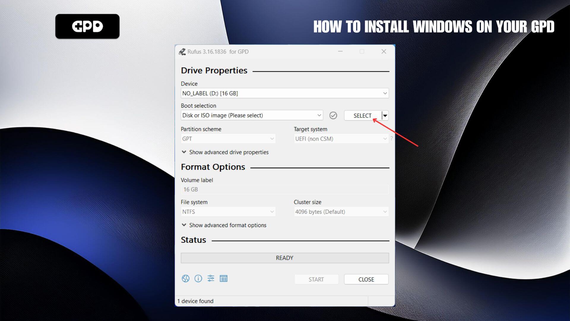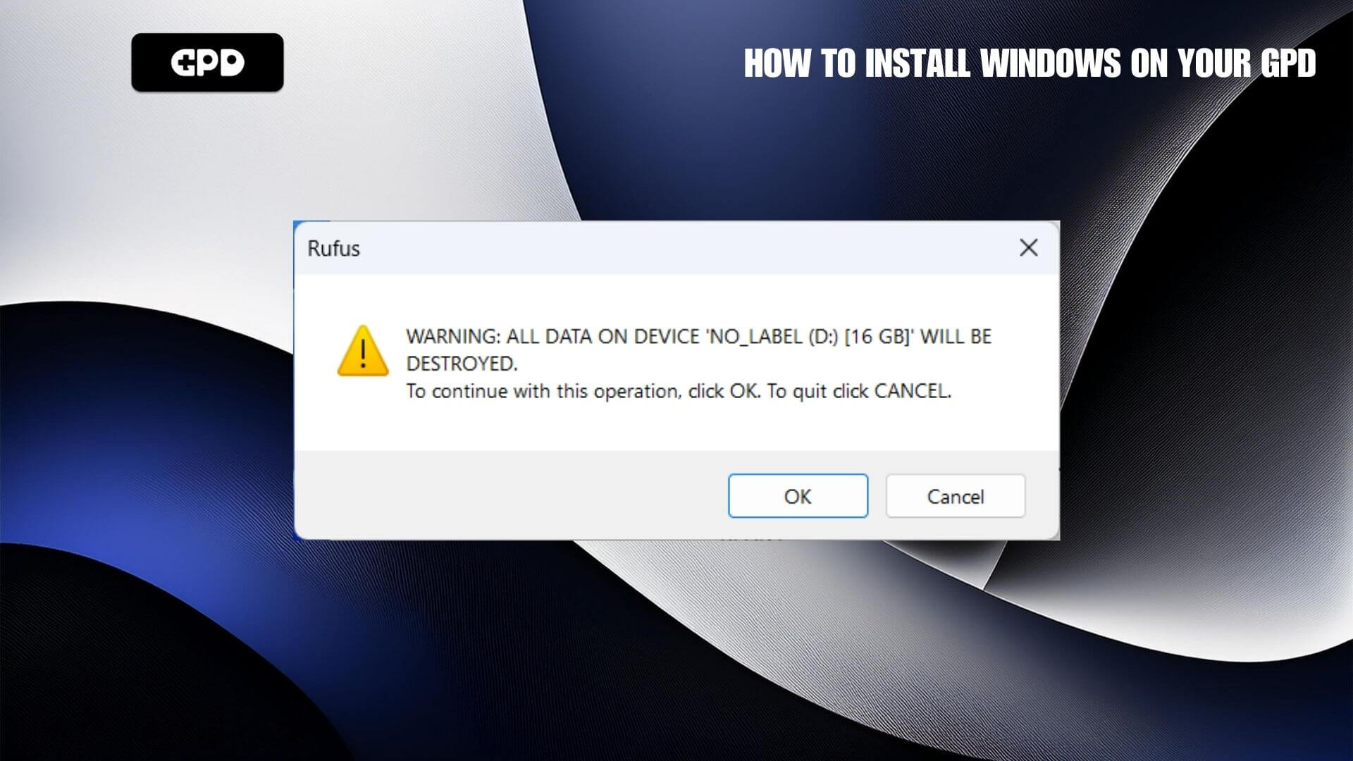 You should have Rufus and the Windows .ISO file for your GPD device. Load Rufus and if prompted click Yes to continue