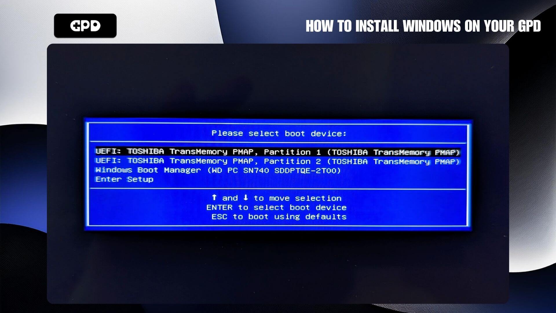 Insert the USB stick into a USB port on your GPD. Power on the device and press the F7 keyboard key repeatedly until the Boot Menu is displayed. Select the USB Stick from the menu and press Enter.