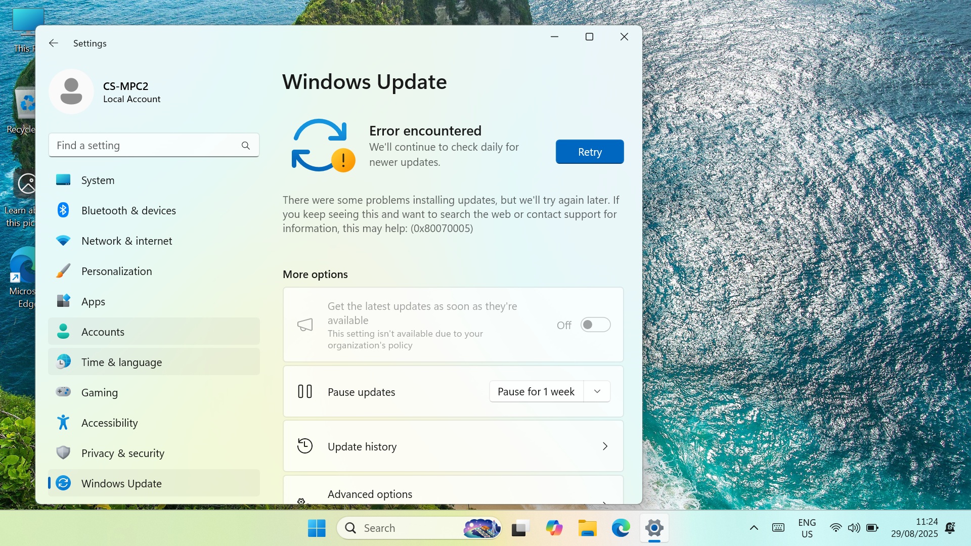 To begin, make sure that Windows Update is repeatedly showing the “Retry” prompt, and error 0x8007005.