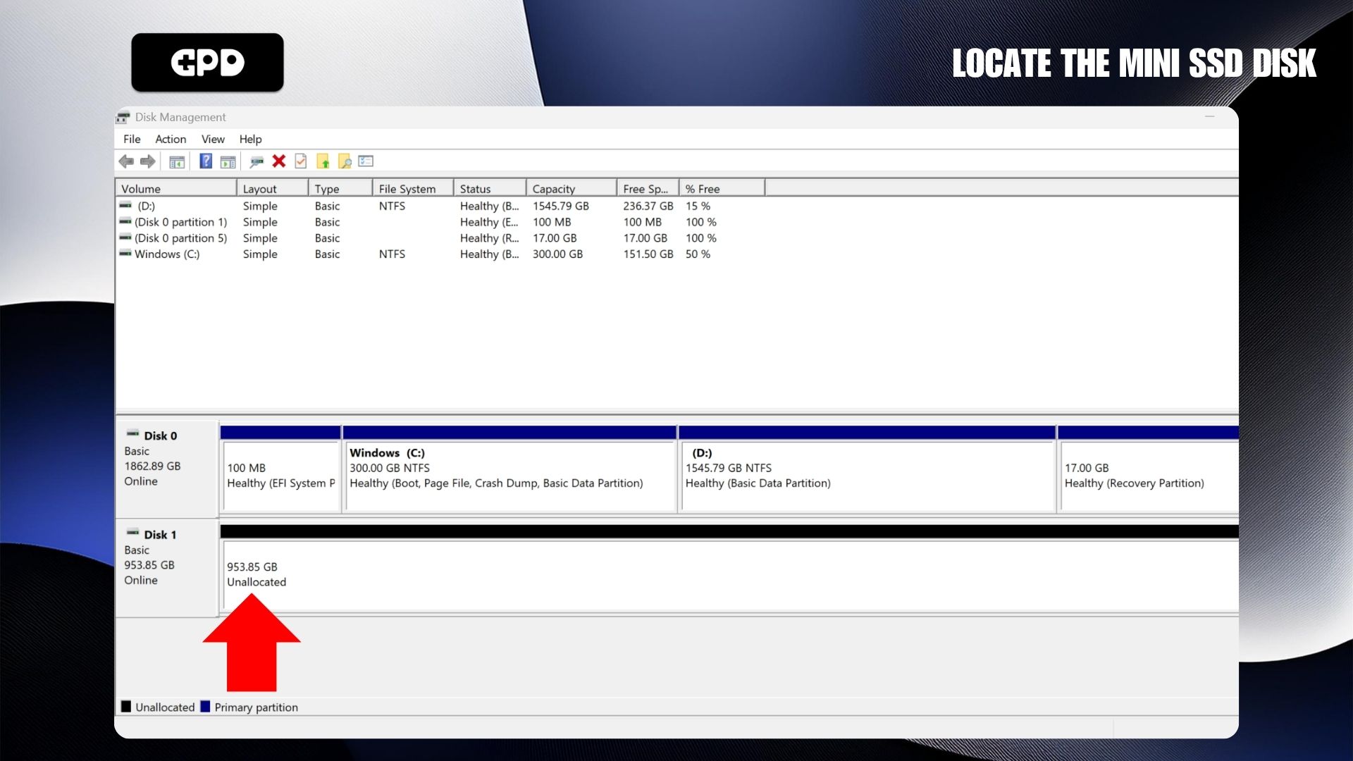 You need to locate the Mini SSD disk from the available volumes. In most cases the drive will be Unallocated and the size will be a good indication. Remember the actual size vs advertised space is different i.e. 1TB = 953.85GB in the below example.