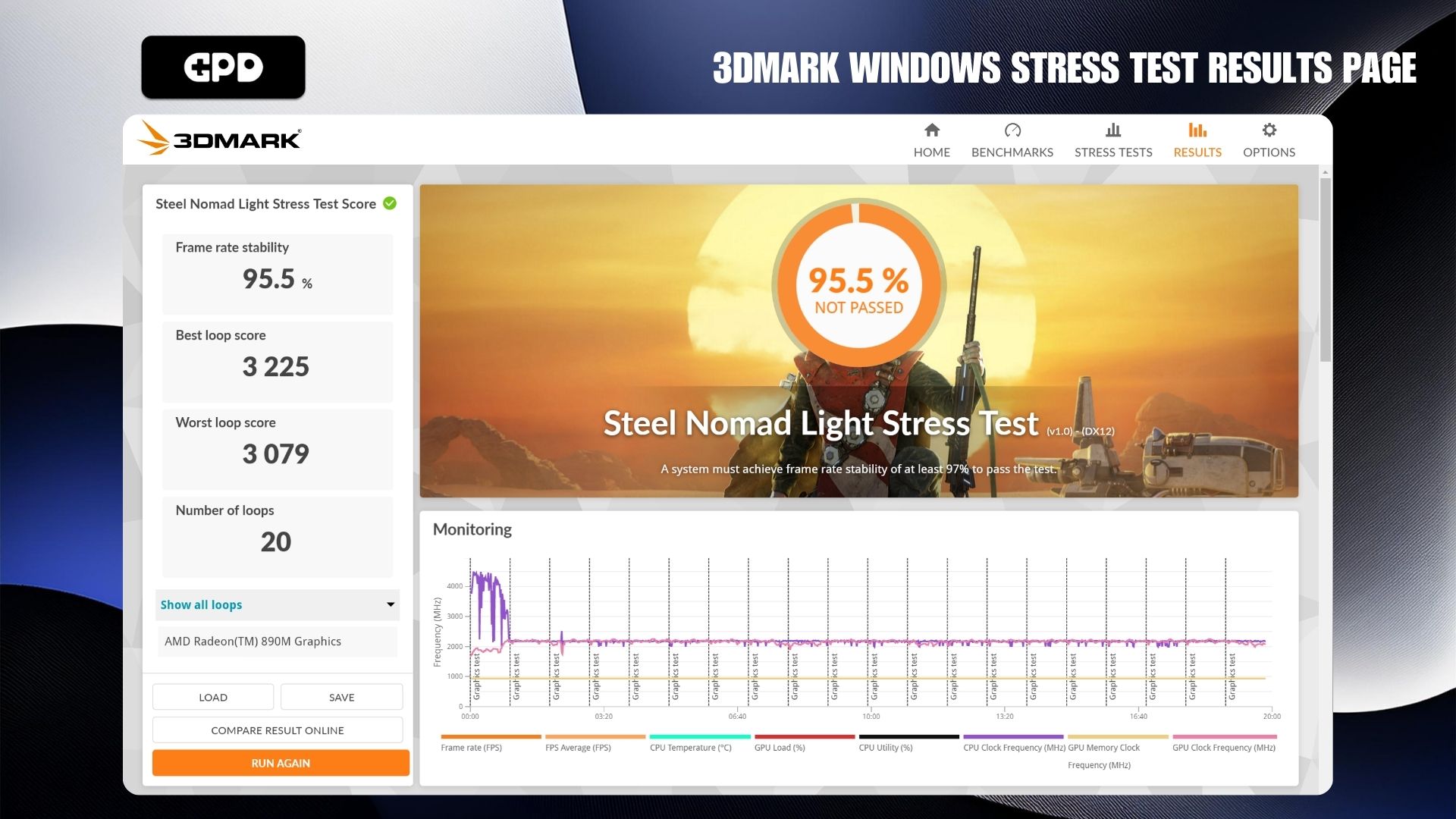 Upon completion of the stress test, a results screen will be displayed. Take note of the “Frame rate stability,” “Best loop score,” and “Worst loop score.” Alternatively, you can capture this information by taking a photograph with your mobile phone or by taking a screenshot (using the Print Screen key) to retain a copy.
