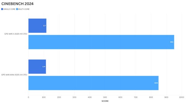 시네벤치 2024의 경우 싱글 코어(117 대 114) 및 멀티 코어(951 대 849) 테스트 모두에서 WIN 4가 미니를 앞섰습니다. 이는 렌더링이나 인코딩과 같은 CPU 집약적인 크리에이티브 작업에서 WIN 4가 Mini 2025(GPD WIN )보다 약간의 우위를 점할 수 있음을 시사합니다. 생산성 도구로도 사용할 수 있는 모바일 게임용 PC를 찾는 분들은 WIN 4를 선호할 수 있습니다.