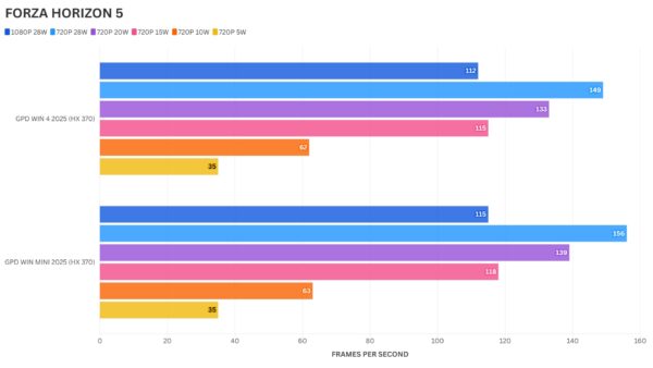 1080P 28W에서 WIN Mini는 115 FPS를 기록한 반면 WIN 4는 112 FPS를 기록했습니다. 720P 28W에서는 그 격차가 약간 더 벌어져 미니가 156FPS를 기록한 반면 WIN 4는 149FPS를 기록했습니다. GPD WIN 차이는 미미하지만 일관되게 나타나고 있어 해상도 전반에 걸쳐 미니 2025가 레이싱 게임 성능에서 약간 앞서고 있습니다. 반응이 빠르고 부드러운 휴대용 게이밍 컴퓨터 경험을 원하는 사람들에게는 이 사소한 우위가 매력적으로 다가올 수 있습니다.