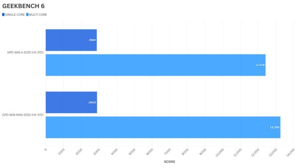 미니 2025(GPD WIN )는 긱벤치 6에서 WIN 4 2025보다 약간 더 나은 성능을 보입니다. 싱글 코어 테스트에서 2900점, 멀티 코어 테스트에서 13,256점을 기록하여 WIN 4의 각각 2884점과 12,419점에 비해 약간 앞섰습니다. 이 소폭의 차이는 특히 멀티스레드 애플리케이션에서 원시 CPU 성능이 약간 더 우수하다는 것을 의미합니다. 휴대용 게임용 PC에서 CPU 집약적인 작업을 실행하려는 사람에게는 WIN Mini가 약간 우위에 있을 수 있습니다.