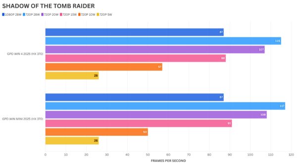1080P 28W에서 두 기기 모두 87FPS로 동률을 이룹니다. 하지만 720P 28W에서는 WIN Mini가 117 FPS에 도달하여 WIN 4의 115 FPS를 근소하게 앞섰습니다. 더 높은 설정에서의 게임 플레이는 비슷하지만, 더 낮은 해상도에서는 WIN Mini가 다시 미세한 이득을 보여줍니다. 이러한 종류의 프레임 속도 우위는 GPD WIN 4 2025와 GPD WIN Mini 2025를 비교할 때 선택에 영향을 미칠 수 있습니다.