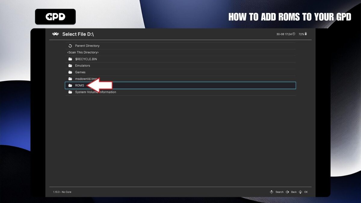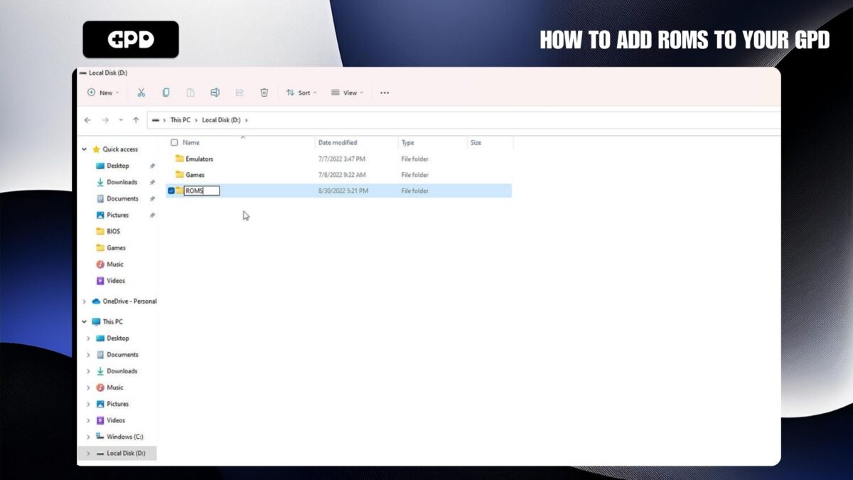 Najpierw utwórz nowy folder na dysku GPD i nazwij go “ROMS”. Wewnątrz tego folderu utwórz podfoldery dla każdej konsoli, na którą posiadasz gry. Na przykład, możesz utworzyć folder o nazwie “Genesis” dla gier na Sega Mega Drive/Genesis.